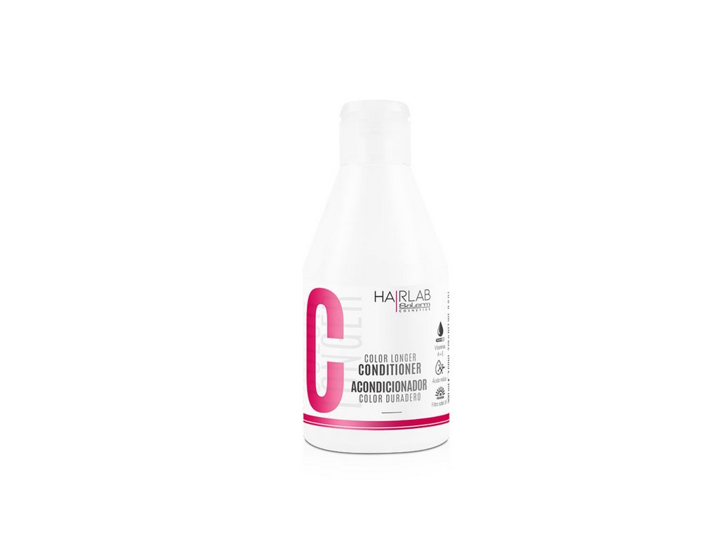 Salerm HAIR LAB Color Longer kondicionér pro barvené vlasy (Color Longer Conditioner/Acondicionador Color Duradero) pomáhá obnovit oslabenou či poškozenou strukturu vlasů po technickém zásahu jako je barvení vlasů. Kondicionér na kyselé bázi je ideální pro barvené vlasy a díky svému koktejlu ovocných kyselin uzamyká barevné pigmenty ve struktuře vlasů. Jojobový olej a přírodní kyseliny získané z ovoce působí jako silný antioxidant a zabraňují tak stárnutí buněk a krepatění vlasů. Kyselá báze kondicionéru napomáhá uzavírat kutikulu vlasového stonku, čímž chrání před ztrátou barevného pigmentu z vlasu. Kondicionér napomáhá nastolit rovnovážné pH vlasů a vlasové pokožky, revitalizuje oslabenou strukturu vlasů a usnadňuje rozčesávání. Vlasům navíc dodává zářivý lesk zvýrazňující krásu barvených vlasů.