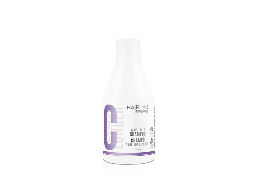 Salerm HAIR LAB Color Longer šampon pro zesvětlené vlasy (White Hair Shampoo/Champú Cabellos Blancos) je speciálně určený pro šedivé, zesvětlené a odbarvené vlasy, protože odstraňuje žluté tóny. Šampon vrací lesk a jas chemicky ošetřených vlasů. Světlé vlasy jsou mnohem více vystaveny škodlivým vnějším faktorům než jiné barvy. Vlivem externího působení dochází postupem času ke žloutnutí blond a zesvětlených vlasů. Zejména působením denních agresí jako je chlor, smog, prach. Jojobový olej a přírodní ovocné kyseliny působí jako silný antioxidant a zabraňují tak stárnutí buněk a krepatění vlasů. Kyselá báze šampónu napomáhá uzavírat kutikulu vlasového stonku, čímž chrání před ztrátou barevného pigmentu z vlasu. Šampon je určen pro vyvážení odstínů žlutých odlesků zvláště u vlasů s vyšší pórovitostí a u vlasů, které vyžadují větší regulaci odstínu. Šampon obsahuje kombinaci barevného pigmentu s fialovým odstínem, který zaručuje postupné odstraňování žlutavých tónů v šedivých vlasech.